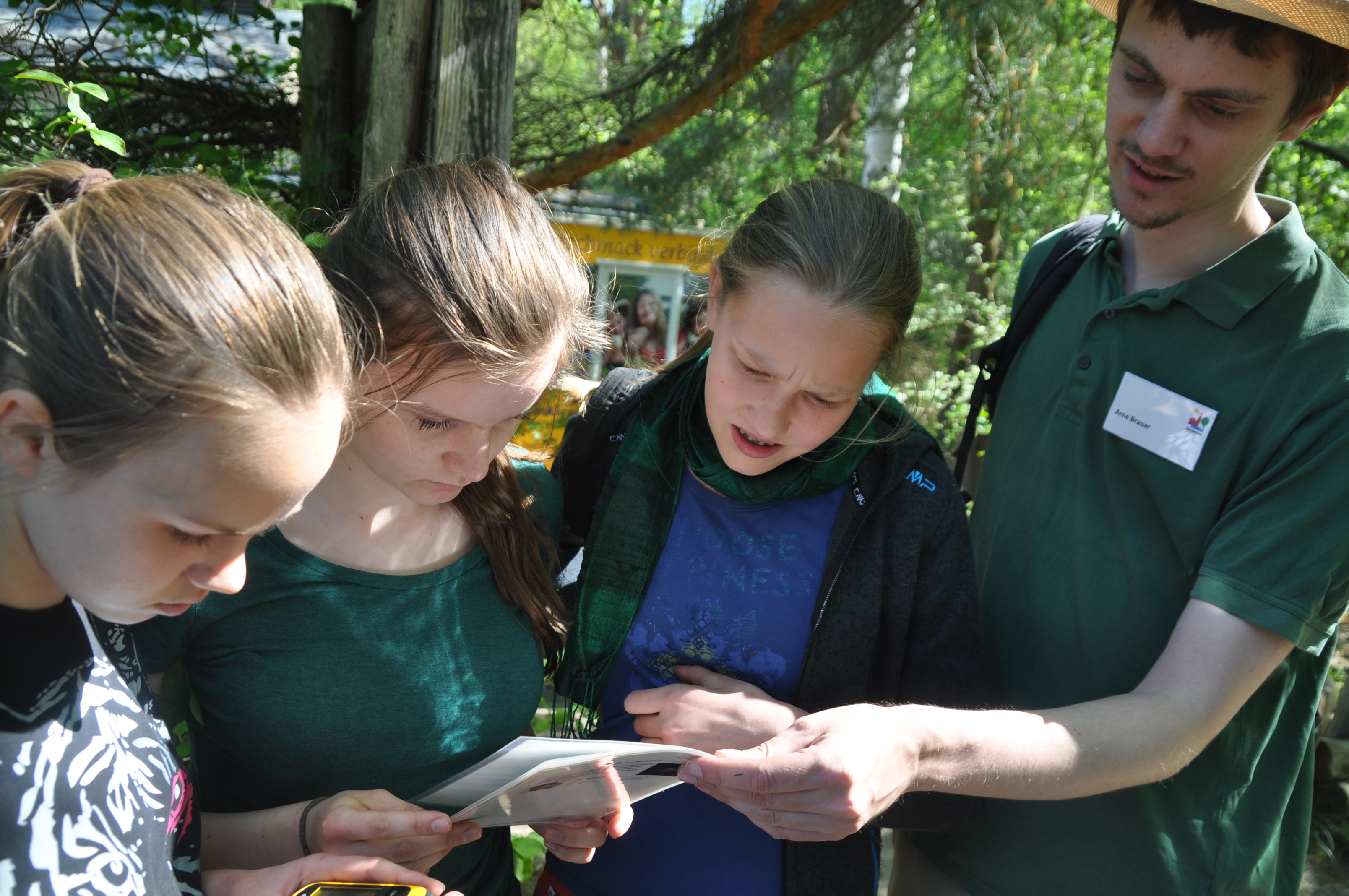 Im Ökowerk angekommen wurde unsere Klasse in zwei Gruppen geteilt. Die eine begab sich mit unserem Klassenlehrer Herr Stark auf die Suche. Wir bekamen eine kurze Einführung zur Benutzung von GPS-Geräten und die ertsten Koordinaten. Sie führten uns zum Eingang des Ökowerks. Dort mussten wir erst mal ein Rätsel lösen um an die nächsten Koordinaten zu kommen. Es gab Aufgaben, wie bestimmte Aussagen zuzuordnen oder Bilder zu Texten zu legen. Z.B gab es Tierbilder und Texte, die wir in die richtige Reihenfolge bringen sollten. Danach sollten wir eines der Tiere (Libelle) aus allem was wir im Wald fanden in Groß nachbauen.