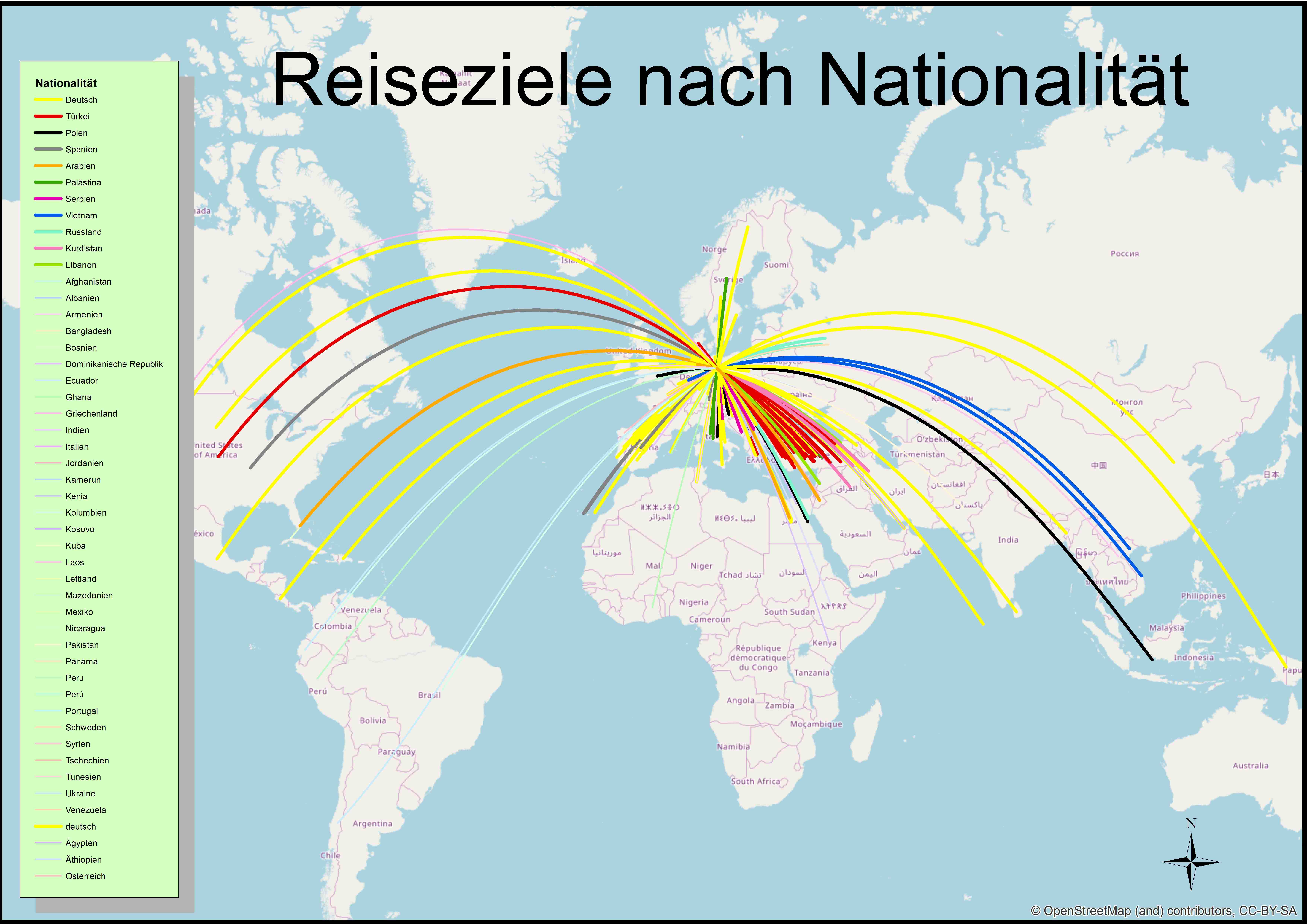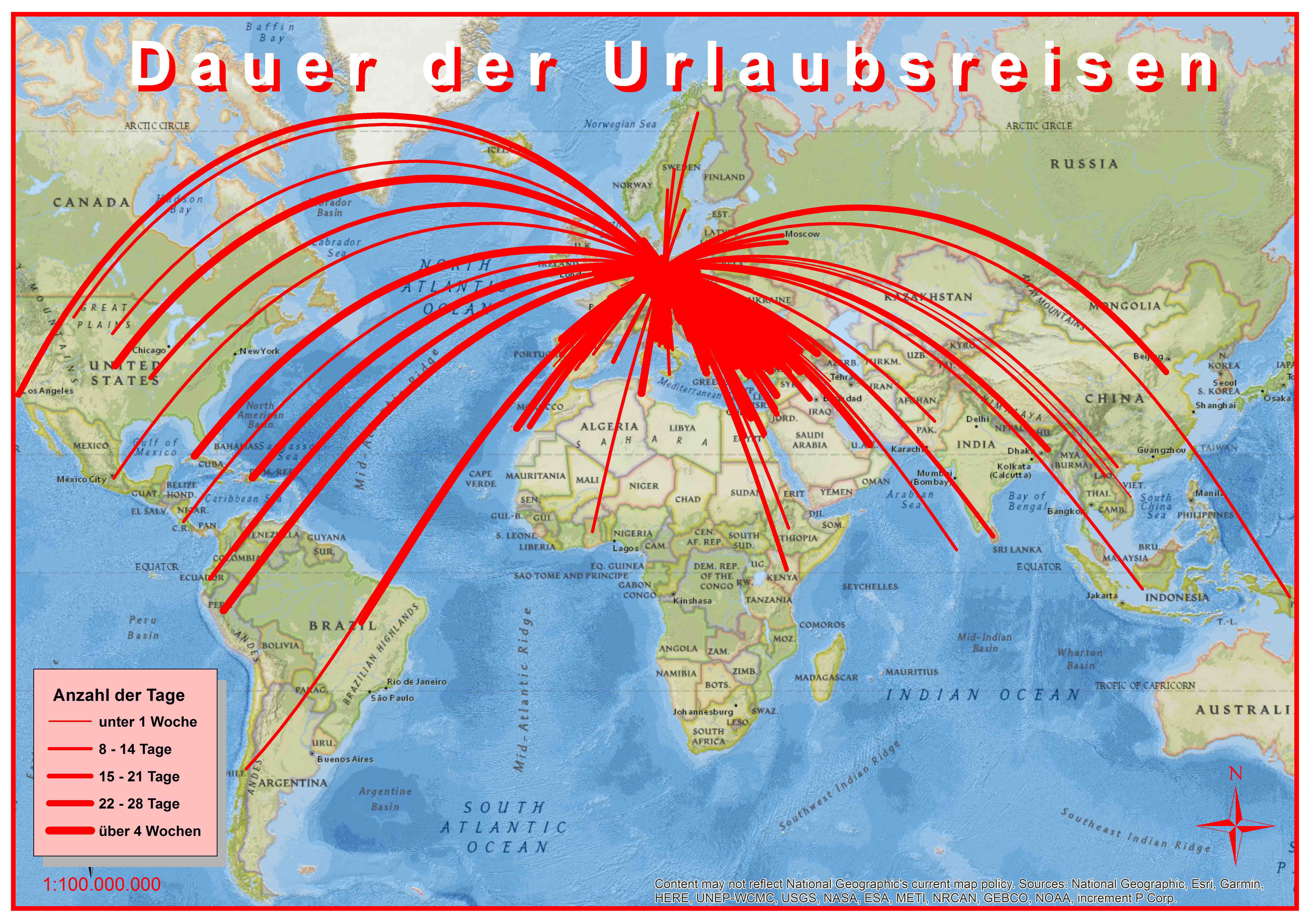 Mithilfe eines Online-Kartendienstes (ESRI-ArcMap) erstellten wir nun aussagekräftige Karten, die beispielsweise zeigen, mit welchen Verkehrsmitteln unserere Schülerinnen und Schüler in den Urlaub fahren, wie lange die Reisen dauerten und ob es Unterschiede der Ziele gibt, wenn man zum bilingualen Zug gehört oder eben nicht.