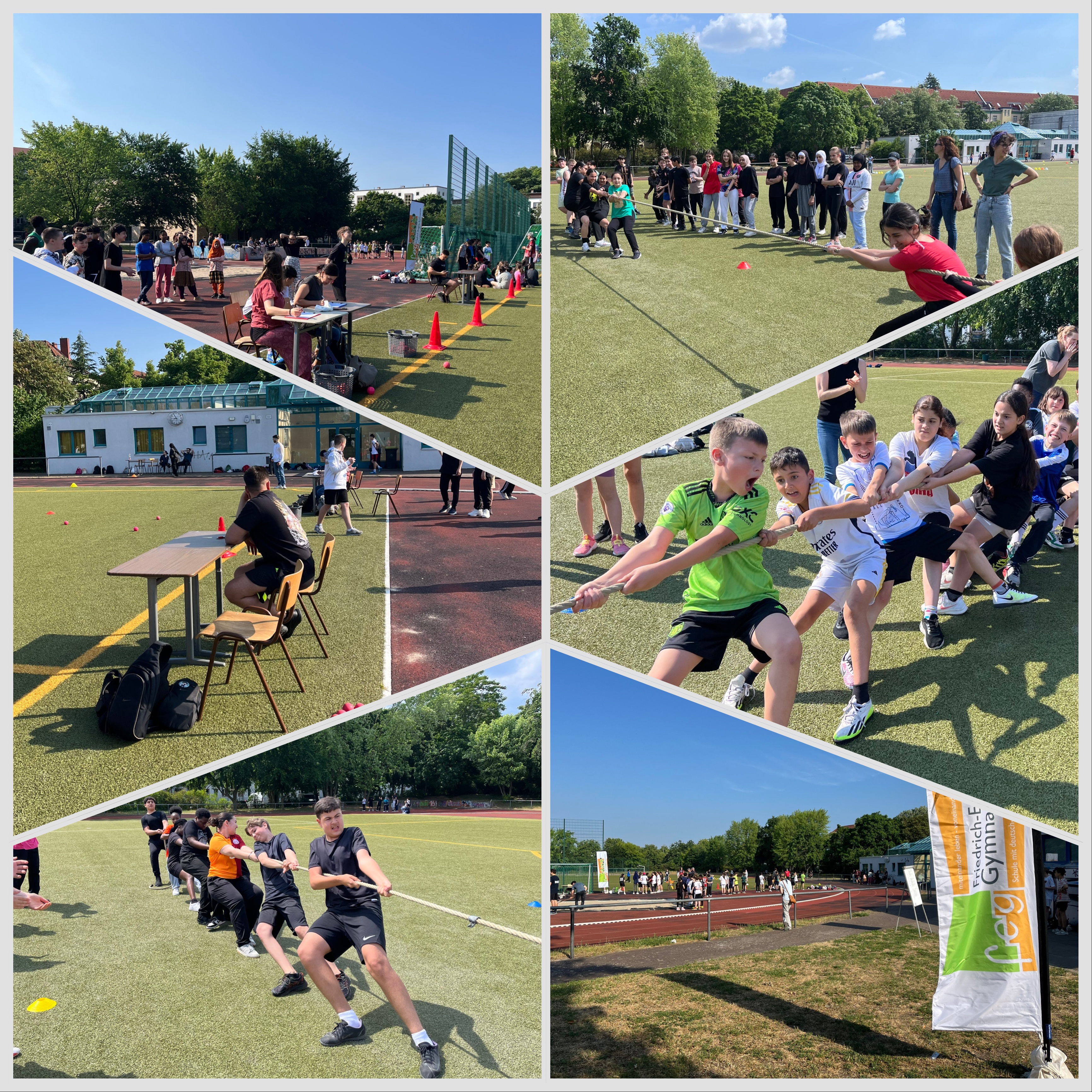 Traditionell fanden am 24.05.2024 die Bundesjugendspiele am FEG statt. Insgesamt haben 626 Schülerinnen und Schüler (von insgesamt 701) daran teilgenommen und in den vier Disziplinen (Sprint, Weitsprung, Weitwurf, Ausdauerlauf) insgesamt 537 Urkunden erkämpft. Neben 153 Teilnehmerurkunden gab es auch 177 Siegerurkunden und ganze 207 Ehrenurkunden. Als zusätzlicher Spaß-Wettkampf fand auch wieder das gemeinschaftliche Tauziehen als Mixed-Mannschaft innerhalb der einzelnen Jahrgänge statt und hat zu viel Engagement und Begeisterung geführt. Ein Kompliment ergeht an alle Sportlerinnen und Sportler, aber auch an die begleitenden und organisierenden Kolleginnen und Kollegen sowie die unterstützende Oberstufe (Q2).