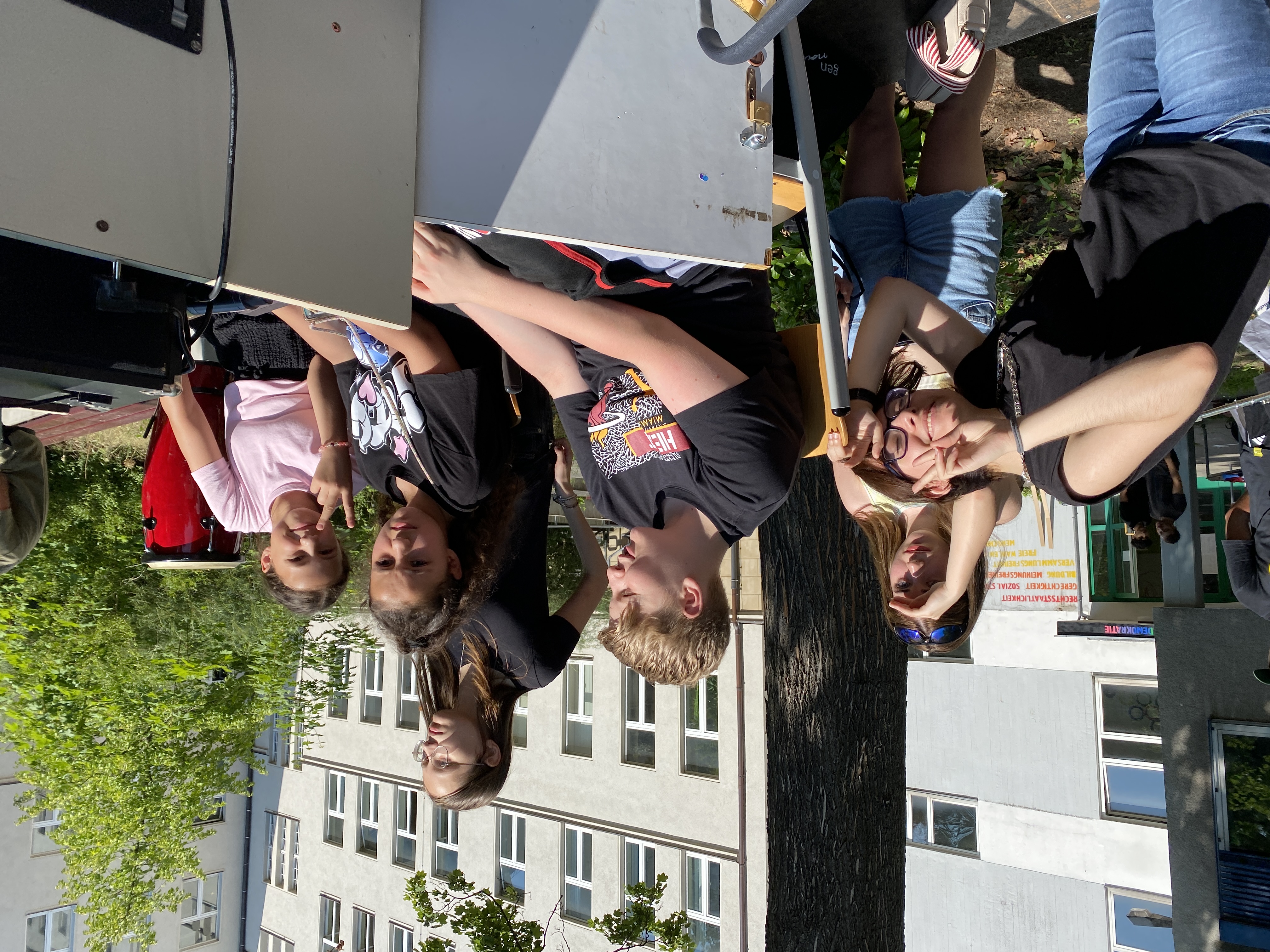 Die Band-AG (Leitung: Frau Oberst) bietet Schülerinnen und Schülern die Möglichkeiten, wöchentlich an ihren Lieblingssongs zu arbeiten und diese im Rahmen verschiedener Auftritte aufzuführen. Die Band-AG entstand in der Corona-Zeit, während in der Schule kaum musiziert werden durfte, und wird seit September 2021 von Marina Oberst geleitet. Für die meisten Schülerinnen und Schüler bietet die Band-AG die einzige Möglichkeit, Instrumental- bzw. Gesangsunterricht wahrzunehmen und mit Gleichaltrigen zu musizieren. Einigen Schülerinnen gab die Band-AG den Anstoß, im Jahr 2023 mit dem Einzelunterricht an der Musikschule zu beginnen. Für die Band ist es aber vor allem wichtig, Erfahrung zu sammeln und als Team zusammenzuwachsen. Die Band trat im Sommer 2022 beim youngStar Festival der Berliner Philharmonie auf. Es war eine grandiose Erfahrung, vor vielen Zuschauern auf einer professionellen Bühne zu stehen. |