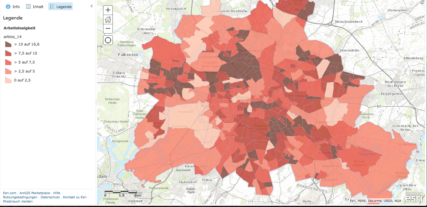 Da diese Daten möglichst kleinräumig die soziale Situation Berlins widergeben sollten, wählten wir 447 LOR’s („lebensweltlich orientierte Räume“) und verknüpften diese zu aussagekräftigen Karten, indem wir das Programm ArcMap von ESRI nutzten.