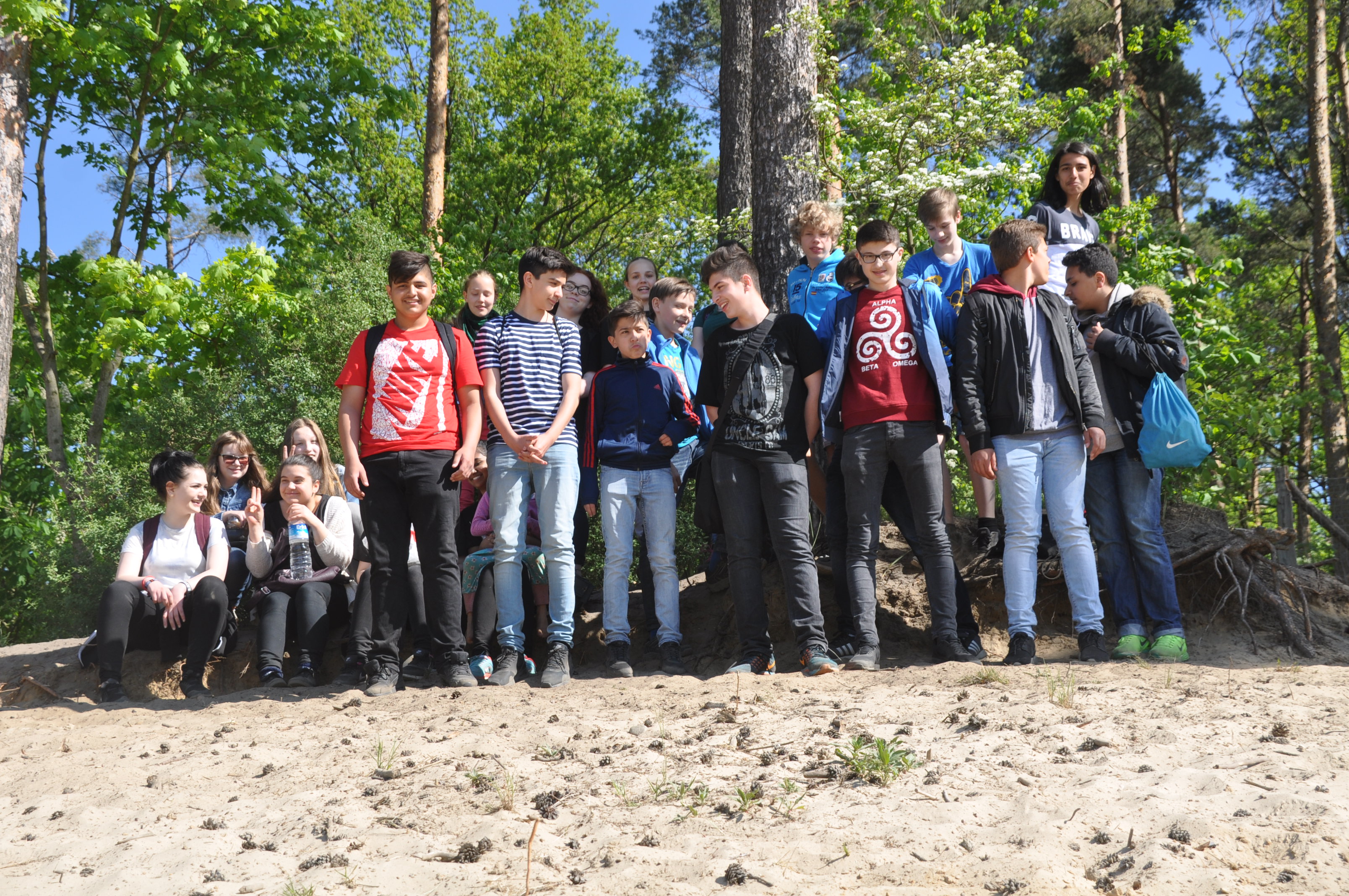 Unser Klassenausflug zum Geocaching im Grunewald begann am S-Bahnhof Grunewald. Von dort aus wanderten wir eine gefühlte halbe Ewigkeit (ca. 30 Minuten) durch den Grunewald. Auf dem sandigem Hauptweg, gesäumt von eindrucksvollen Eichen und Kiefern, waren deutlich Wildschweinspuren zu erkennen. Auf unserem Weg zur Kiesgrube begegneten wir Eichhörnchen, Spechten und vielem anderem Getier. Endlich angekommen, bat sich uns ein fantastischer Ausblick. Das 13 Hektar umfassende Naturschutzgebiet ist eine Oase der Flora und Fauna. Von oben sieht man den riesig wirkenden Sandabhang der in eine große Kuhle führt. Der Horizont wird von einer Waldfront verdeckt, bestehend aus Kiefern. Neben der Kiesgrube liegt ein kleiner Weiher, dem Zuhause von Fischen bis Wasserläufern, umrandet von einer kleinen Grasfläche.
