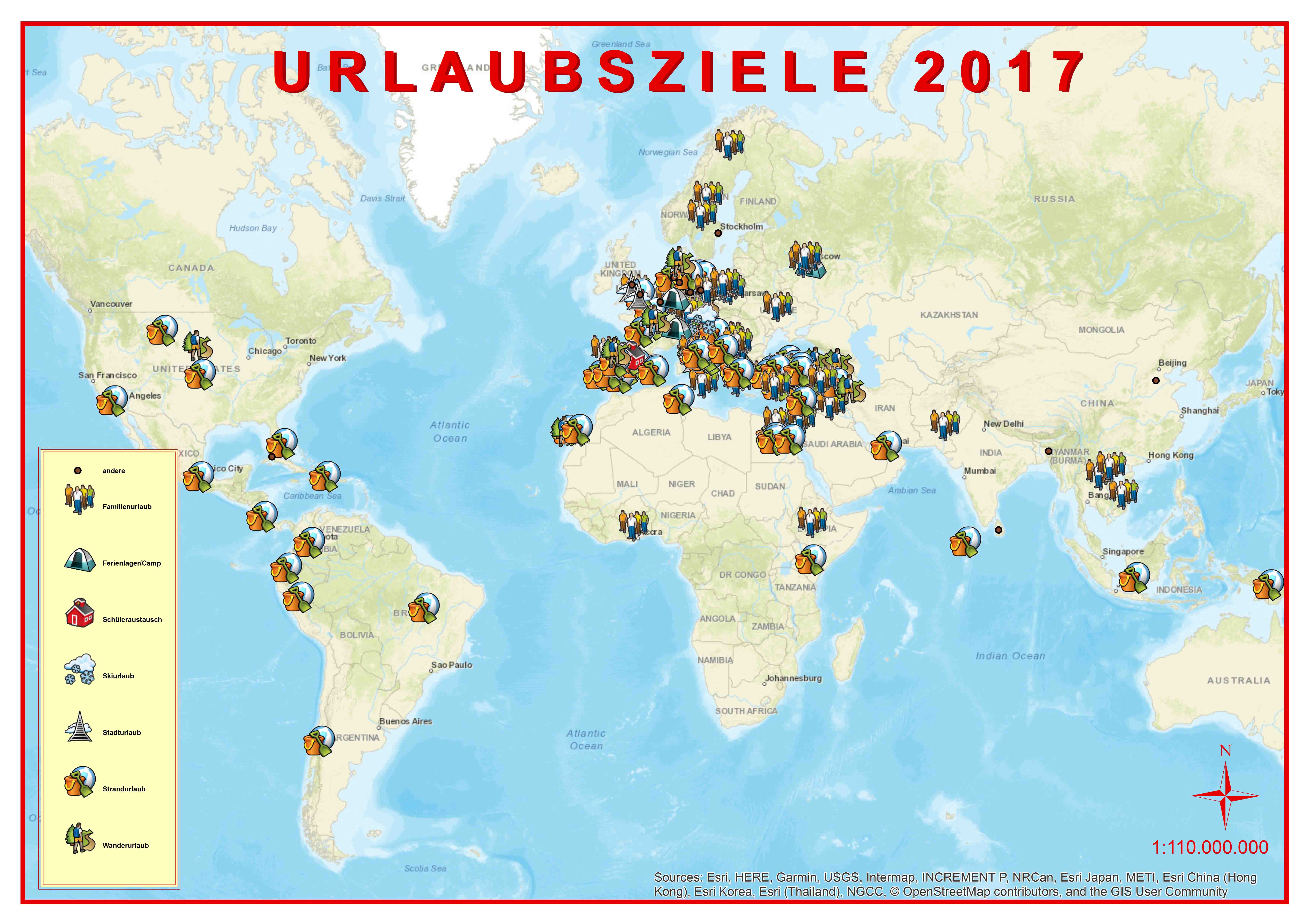 Mithilfe eines Online-Kartendienstes (ESRI-ArcMap) erstellten wir nun aussagekräftige Karten, die beispielsweise zeigen, mit welchen Verkehrsmitteln unserere Schülerinnen und Schüler in den Urlaub fahren, wie lange die Reisen dauerten und ob es Unterschiede der Ziele gibt, wenn man zum bilingualen Zug gehört oder eben nicht.