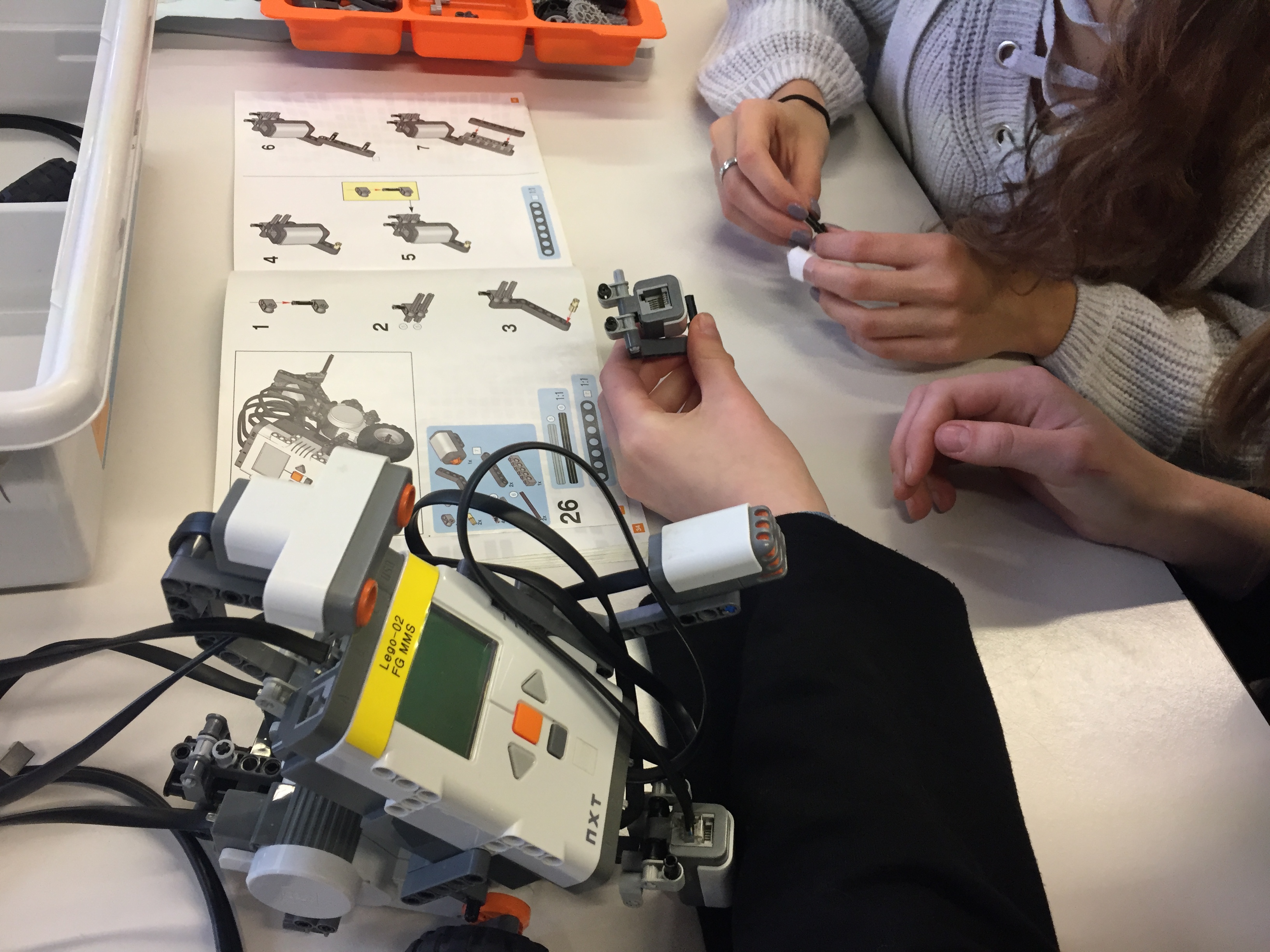Infolgedessen haben wir angefangen den Roboter Roberta zu bauen. Dazu benötigten wir eine Lego-Grundausstattung. Darin befanden sich Kästchen mit vielen kleinen Lego-Teilchen, verschiedenen Motoren, Räder und Sensoren. Nachdem wir damit fertig waren, hat uns die studentische Hilfskraft gezeigt, wie man den Roboter mit „Leben füllt“, ihn also programmiert.